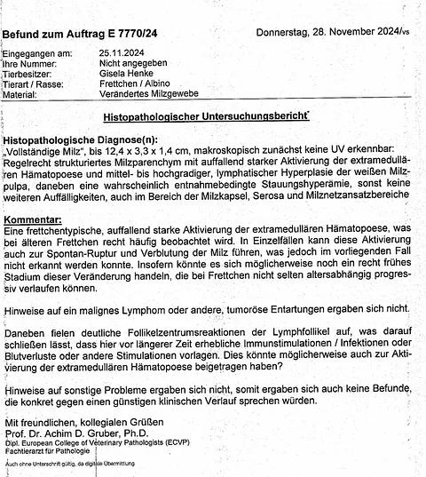 Frettchenrüde "Bunny", 5,5 Jahre alt, 1100g, wurde auf Grund einer vergrößerten Milz erst vorgestellt nachdem er seit ca. 1/2Jahr Cortison bekommen hatte, da nach Röntgen- und Ultraschalluntersuchungen der Verdacht auf ein Lymphom bestand, denn es waren etliche "Löcher" in der Milz entdeckt worden. Bei unserer Untersuchung konnte eine vergrößerte Milz, ca. 15x7cm ertastet werden. Er hatte abgenommen, war etwas anämisch und schlapper als sonst. Leider wurde er am Tag vor der geplanten Milzoperation wegen zunehmender Schwäche euthanasiert. Eine pathologische Untersuchung zeigte keinerlei Milzveränderungen außer der ca. 4-fachen Vergrößerung. Die Eintrittsöffnungen der Blutgefäße täuschten wahrscheinlich die sonografisch diagnostizierten "Löcher" vor. Vermutlich lag eine extramedulläre Hämatopoese vor. Auch lagen keinerlei andere pathologische, makroskopisch sichtbare andere Organbefunde vor. Leider konnte nicht geklärt werden, ob bei einem früheren operativen Eingriff und kürzerer Cortisongabe "Bunny" älter als 5,5Jahre alt geworden wäre.