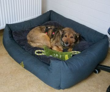 Zur Narkosevorbereitung wurde ihr Glucose5% plus Sterofundin s.c. (20ml) , das Schmerzmedikament Tolfenaminsäure s.c. (4mg/Tier), Amoxiclav s.c.(14/3,5mg/Tier), Dexamethason i.m. (0,2mg/Tier) und Diazepam i.m. (0,75mg/Tier) injiziert, 30 Min später erfolgte die Injektionsnarkose (30mg/kg Ketamin und 0,02mg/kg Xylazin i.m.), zur Aufrechterhaltung bekam sie O2 und Isofluran über eine Maske. Bei der Eröffnung der Bauchhöhle fiel uns sofort die Milz mit drei Tumoren von erbs- bis kirschgroß (makroskopisch Hämangiome) auf. Deshalb entschlossen wir uns vorrangig eine Splenektomie durchzuführen. Nach der Entfernung wurde das Pancreas aufgesucht. Leider bestand dieses nur aus einer entzündlich hochgeröteten Masse, ohne dass ein Insulinom oder ein anderes tumoröses Geschehen zu erkennen gewesen wäre. Auch die Leber war frei von Metastasen. Deshalb wurde die Bauchhöhle verschlossen. Die Aufwachphase war mit ca. 2Std leicht verzögert. In den Tagen danach bekam Angie Amoxiclav und Schmerzmedikamente (erst Tolfenaminsäure, später Carprophen 2xtgl. 1mg/kg). Unter Proglicem25 (2xtgl. 1/2 Kapsel) und Prednisolon (1,25mg 1xtgl/Tier) konnte die Hypoglycämie kontrolliert werden. Fast 3 Jahre später mußte Angie mit über 8 Jahren wegen unkontrollierbarem Giardiendurchfall, kontinuierlich zunehmender Inappetenz und Gewichtabnahme euthanasiert werden. Die Sektion offenbarte eine ca. bohnengroße, derbe, höckerige Umfangsvermehrung in der Bauchspeicheldrüse (komplexer Pankreastumor?) die makroskopisch keinerlei Ähnlichkeit mit den üblichen glatten Insulinomen (ähnlich rötlichen Sagokörnern) hatte. Der Rest der Bauchhöhle, war o.b.B., aber diese Umfangsvermehrung und der Giardiendurchfall erklärten das schlechte Allgemeinbefinden.
